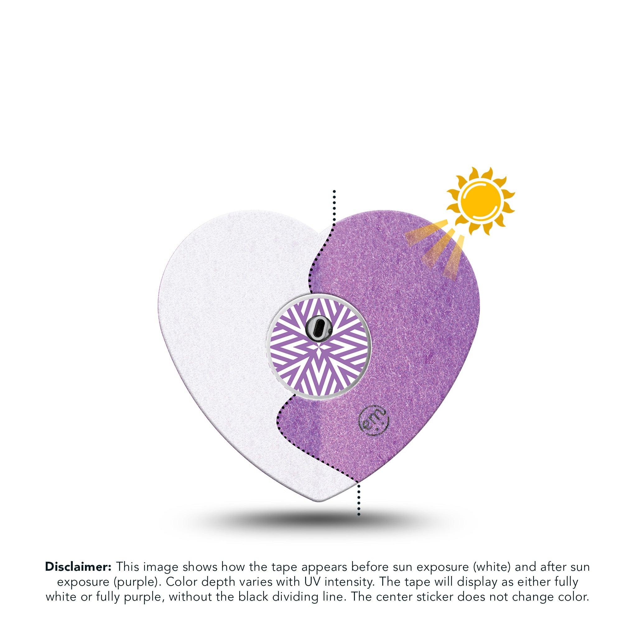 Disclaimer: This image shows how the Solar Violet design appears before sun exposure (white) and after sun exposure (purple). Color depth varies with UV intensity. The tape will display as either fully white or fully purple, without the black dividing line. The center sticker does not change color.