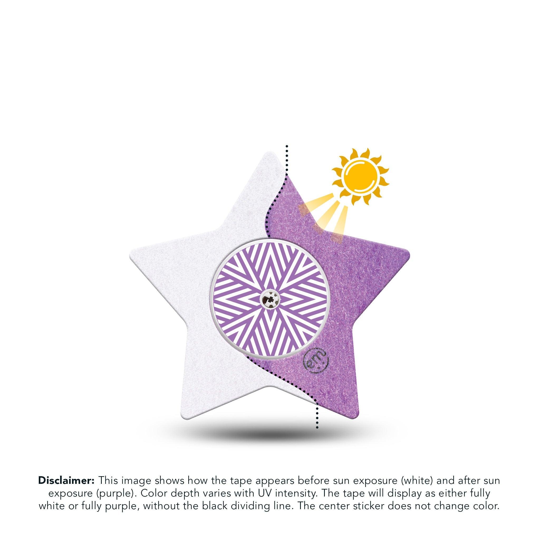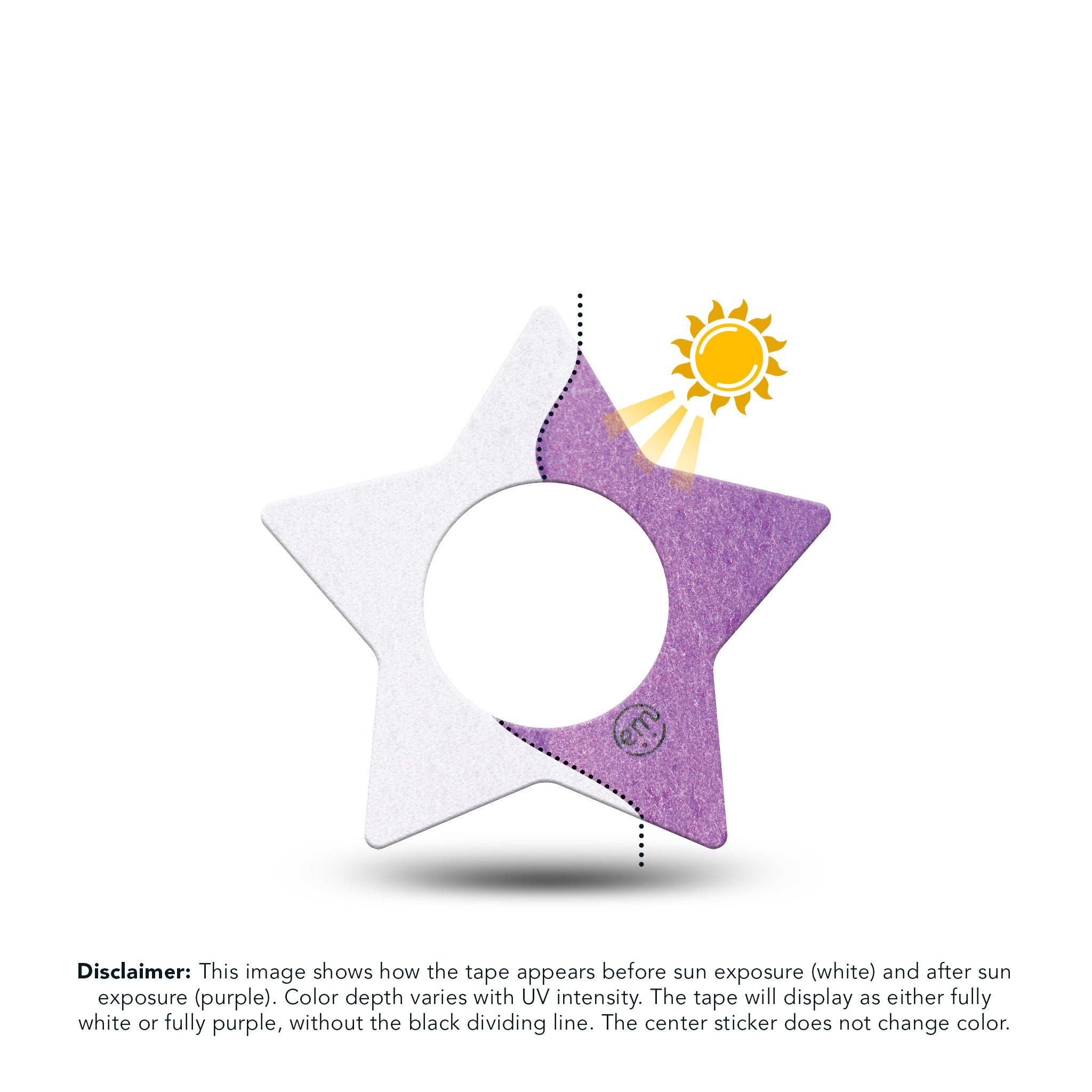 Disclaimer: This image shows how the Solar Violet design appears before sun exposure (white) and after sun exposure (purple). Color depth varies with UV intensity. The tape will display as either fully white or fully purple, without the black dividing line. The center sticker does not change color.