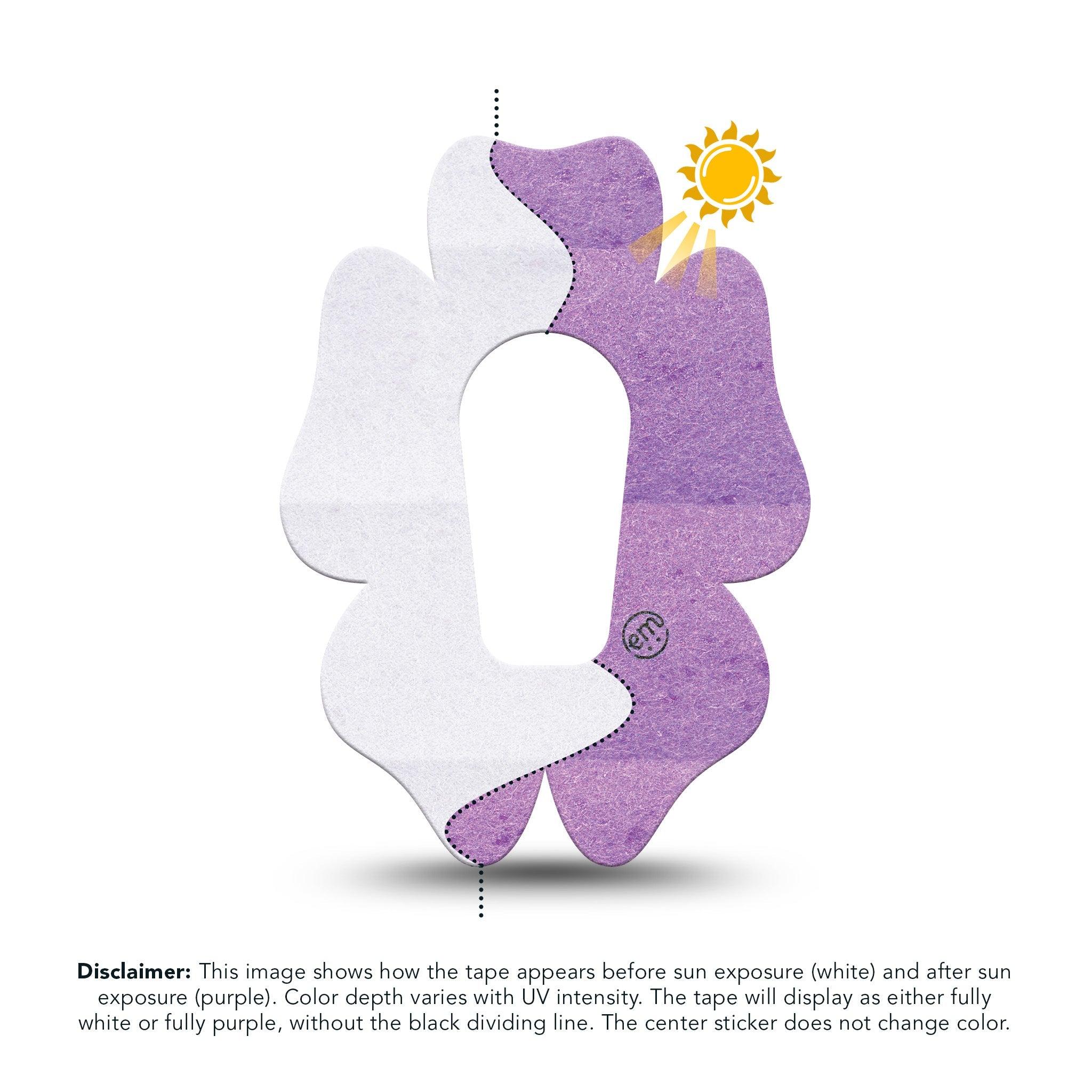 Disclaimer: This image shows how the Solar Violet design appears before sun exposure (white) and after sun exposure (purple). Color depth varies with UV intensity. The tape will display as either fully white or fully purple, without the black dividing line. The center sticker does not change color.