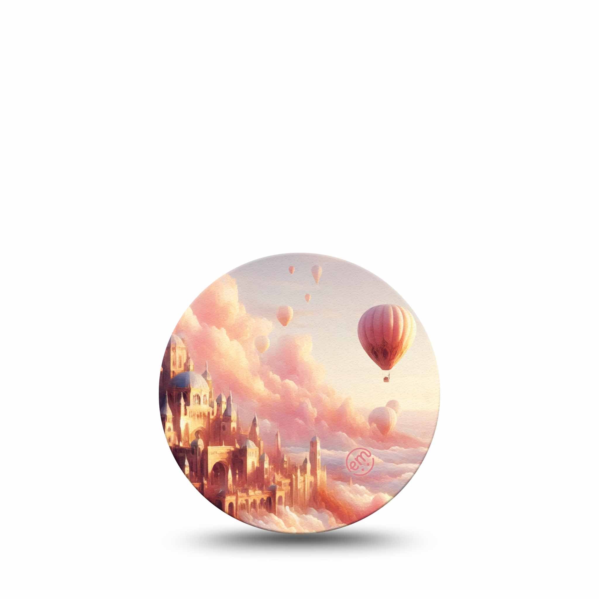 Float above the clouds with whimsical hot air balloons drifting over a cityscape.