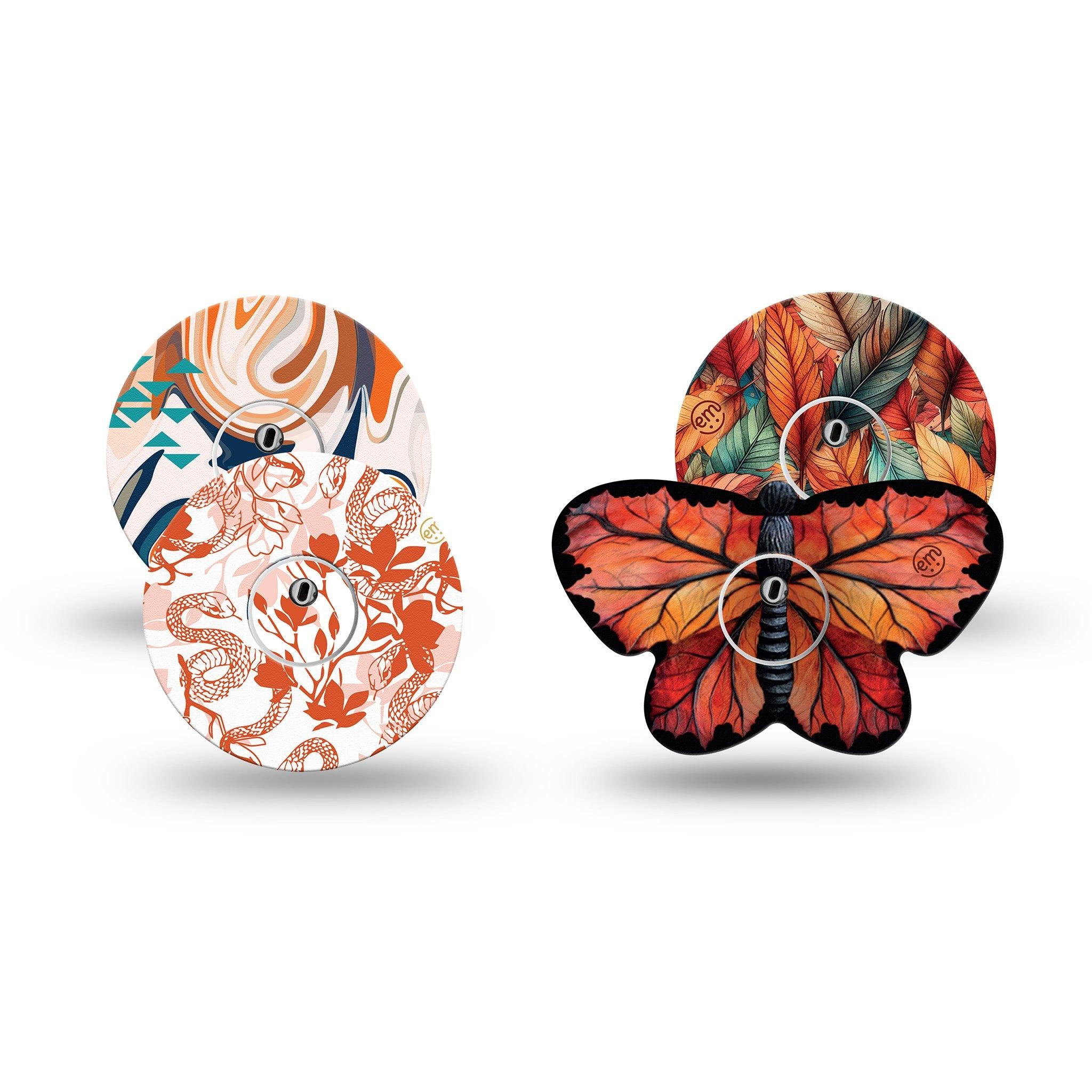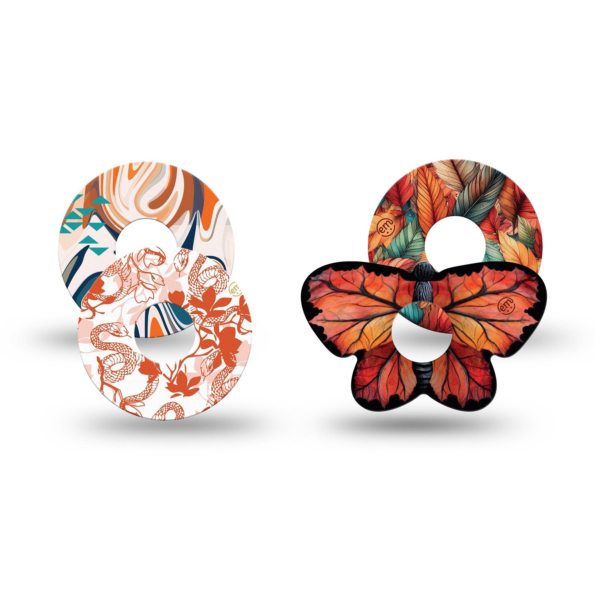 This cozy fall themed pack blends rustic orange tones with blue teals perfect for the season. Pack contains one of each of our Leaf Butterfly, Fall Leaf Feathers, Lava Coil Floral, and The EM Swirl designs.