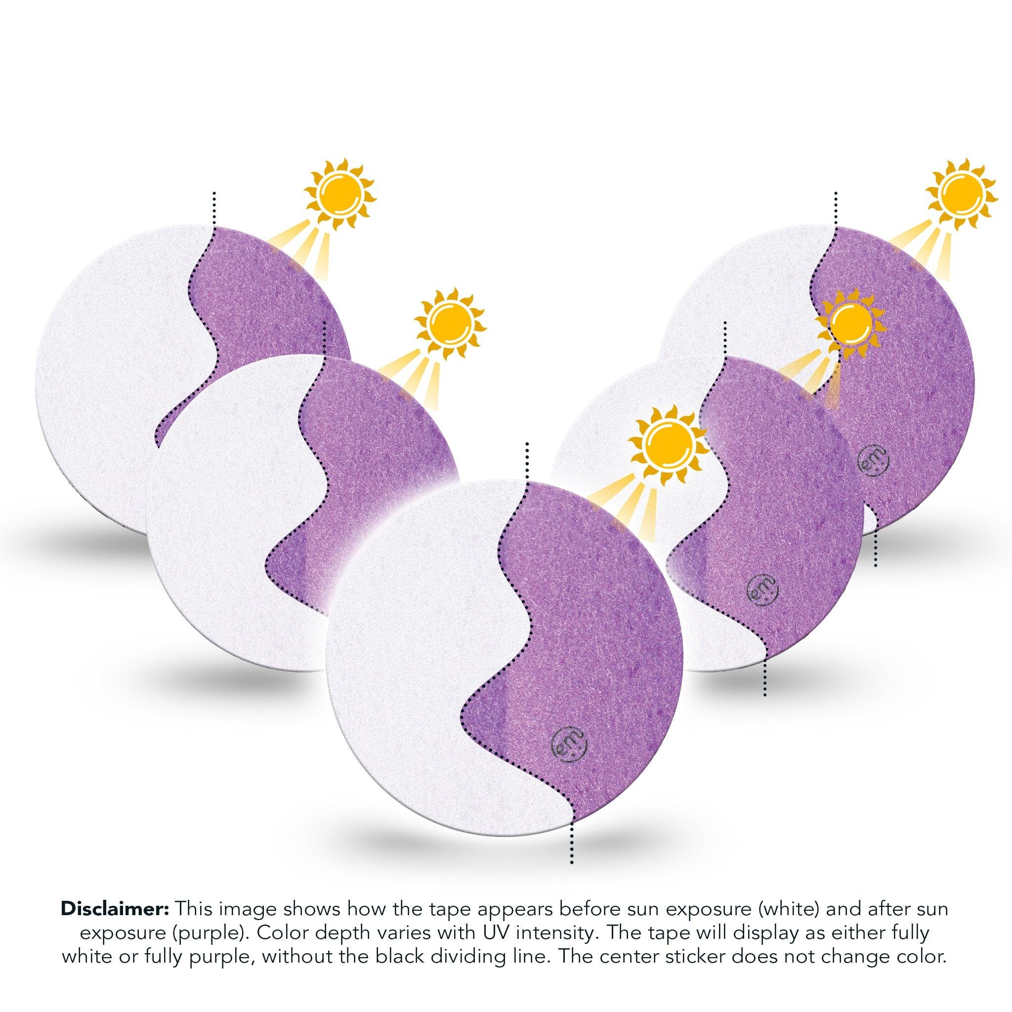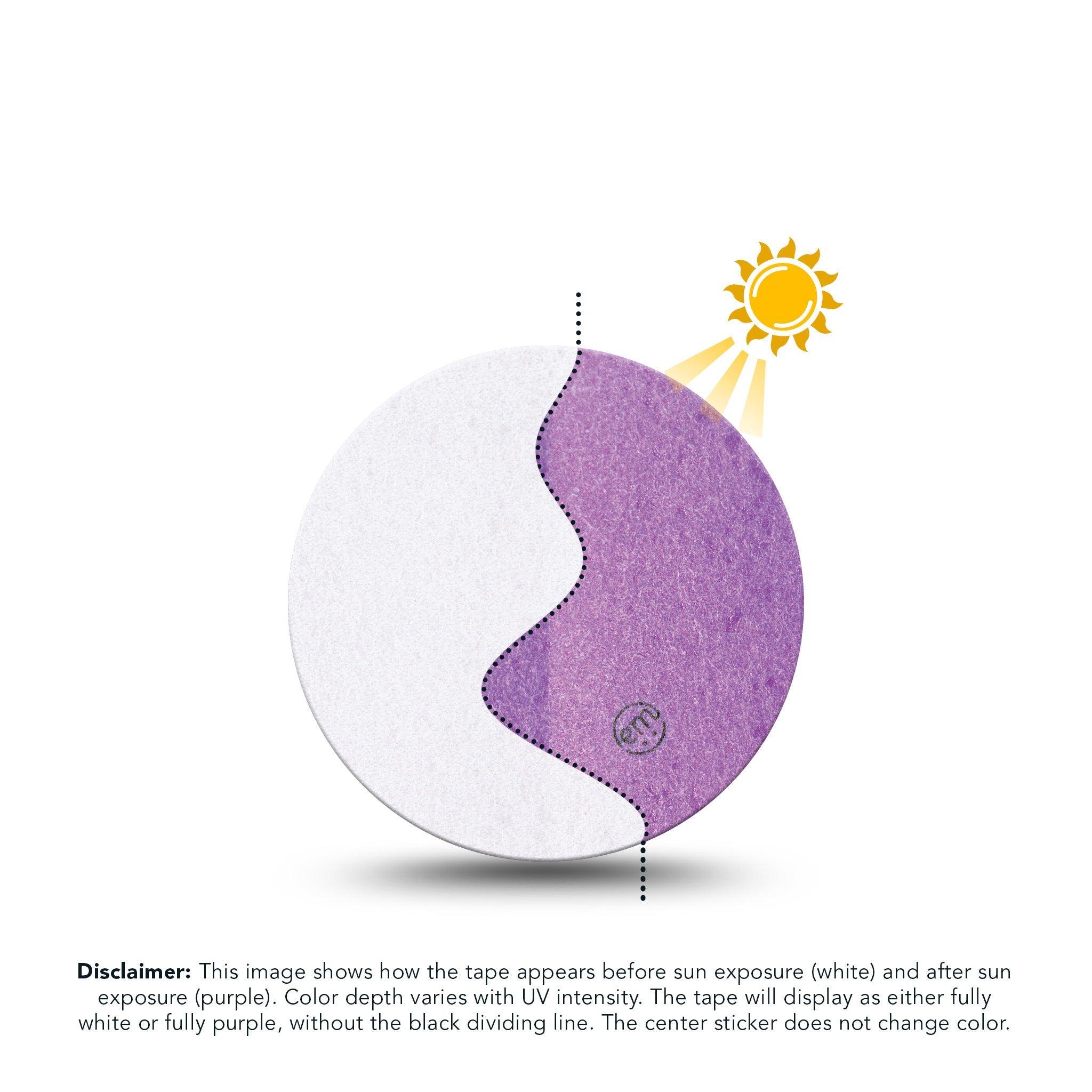 Disclaimer: This image shows how the Solar Violet design appears before sun exposure (white) and after sun exposure (purple). Color depth varies with UV intensity. The tape will display as either fully white or fully purple, without the black dividing line. The center sticker does not change color.